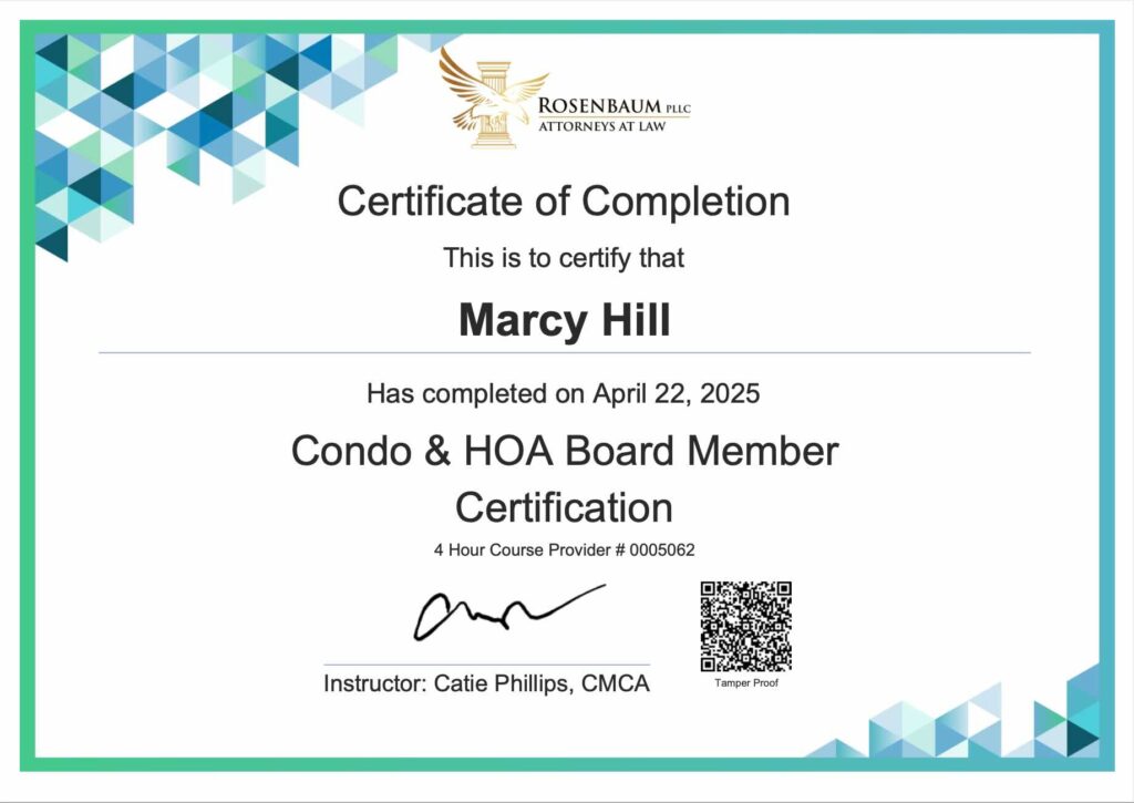 Here are the certificates for current board members of Stonewood HOA: