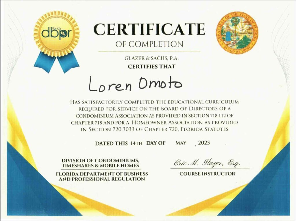 Florida Statute 720.3033 requires each director of a homeowners association (HOA) to submit a certificate of having satisfactorily completed the educational curriculum administered by a department-approved education provider.